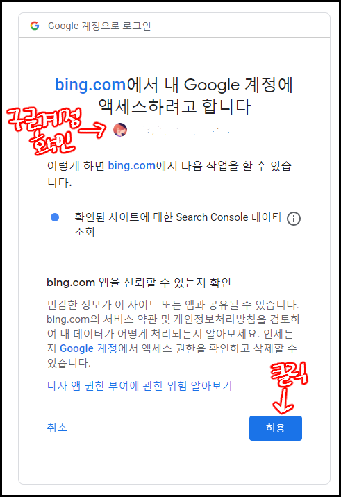 - 구글 서치 콘솔에 등록했던 계정이 맞는지 확인해주시고 허용 버튼을 클릭합니다.