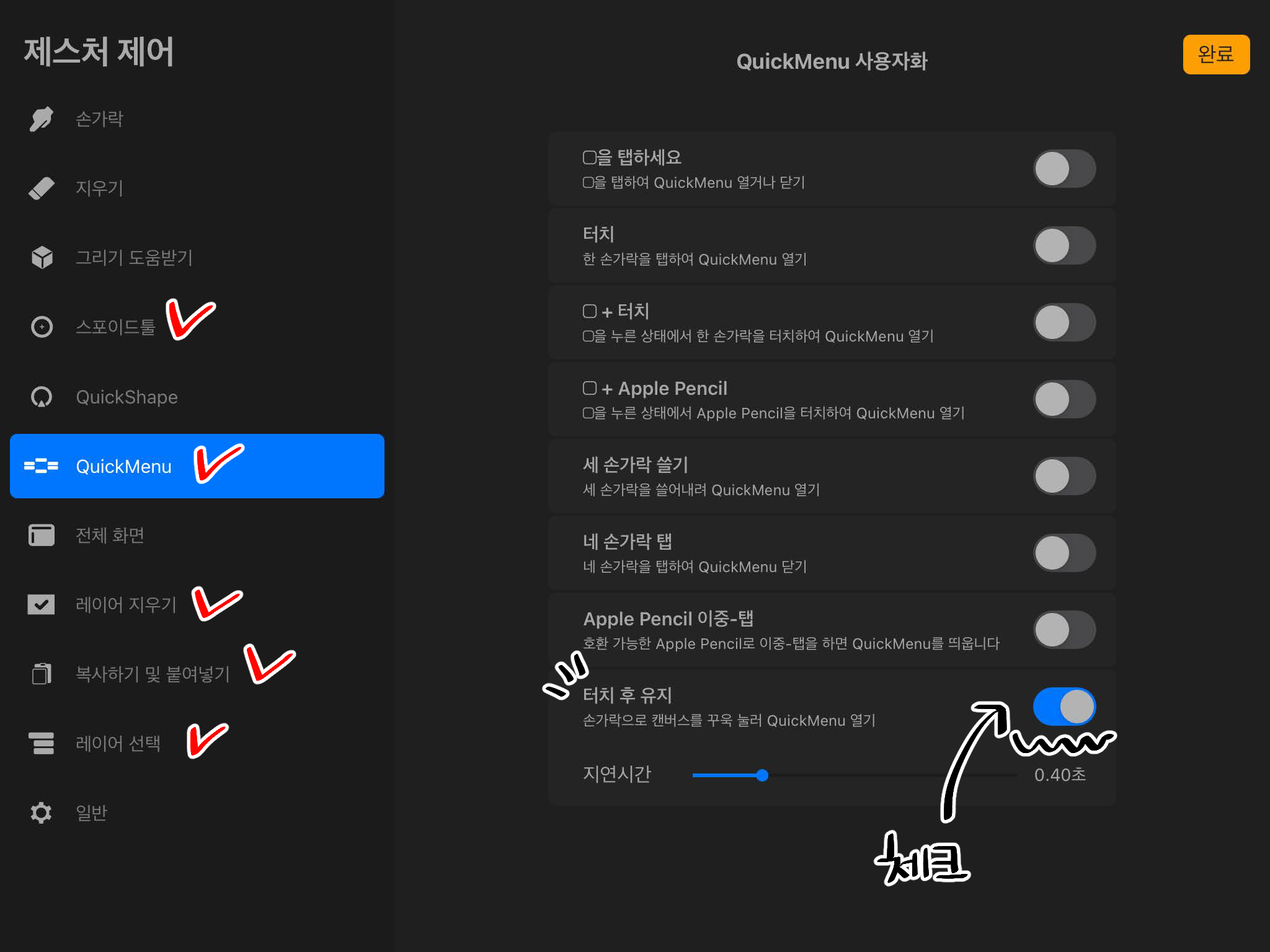 - 그래서 제스처 제어 스포이드툴 기본 설정은 터치 후 유지가 체크되어 있을 거예요.