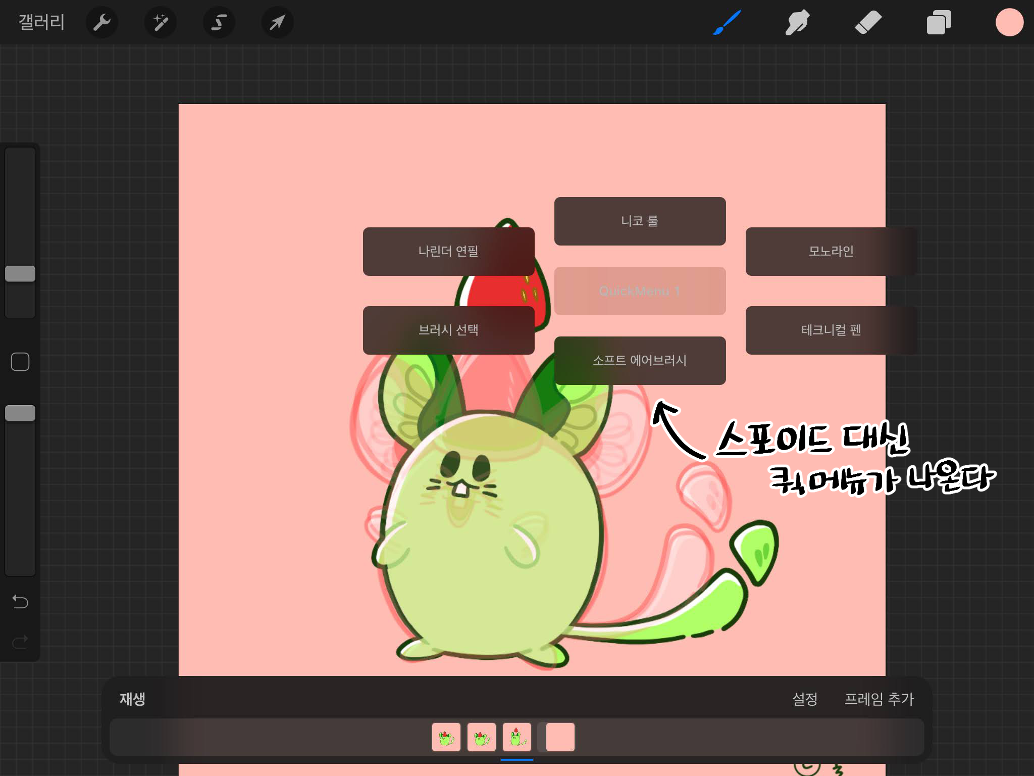 - 손가락 하나를 꾸욱 누르면 스포이드대신 퀵메뉴가 나옵니다.