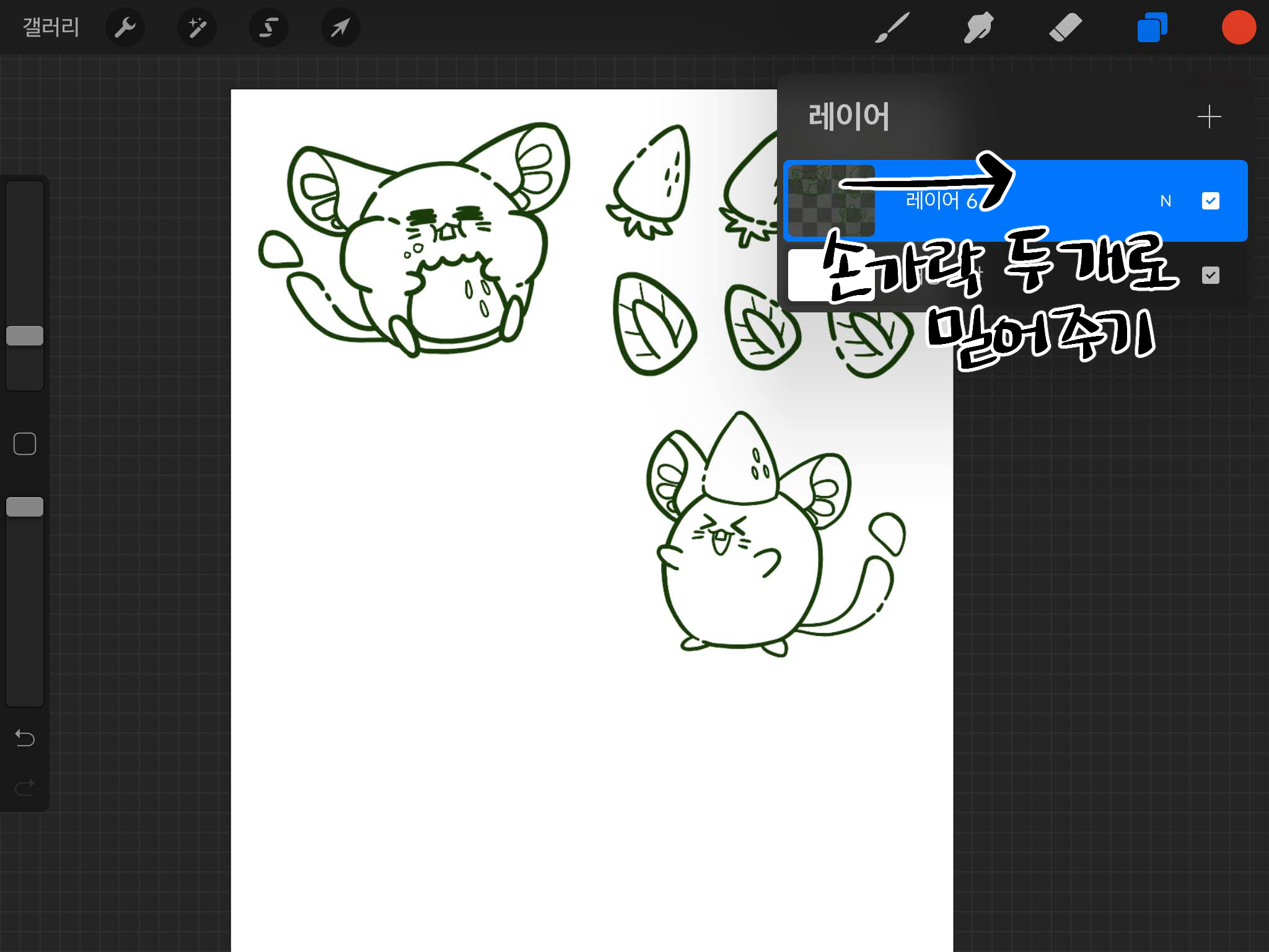 - 손가락 두 개를 이용해 레이어를 왼쪽에서 오른쪽으로 밀어줍니다.