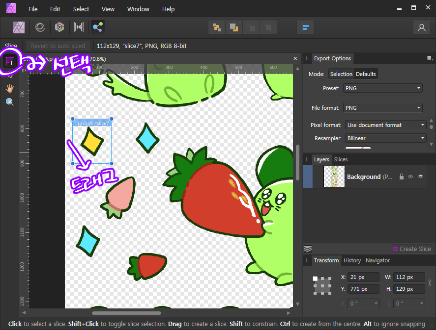 - Export는 추출하다는 뜻으로 Export Persona는 슬라이스를 이용해 캔버스에서 특정 영역을 추출할 수 있는 채널입니다.