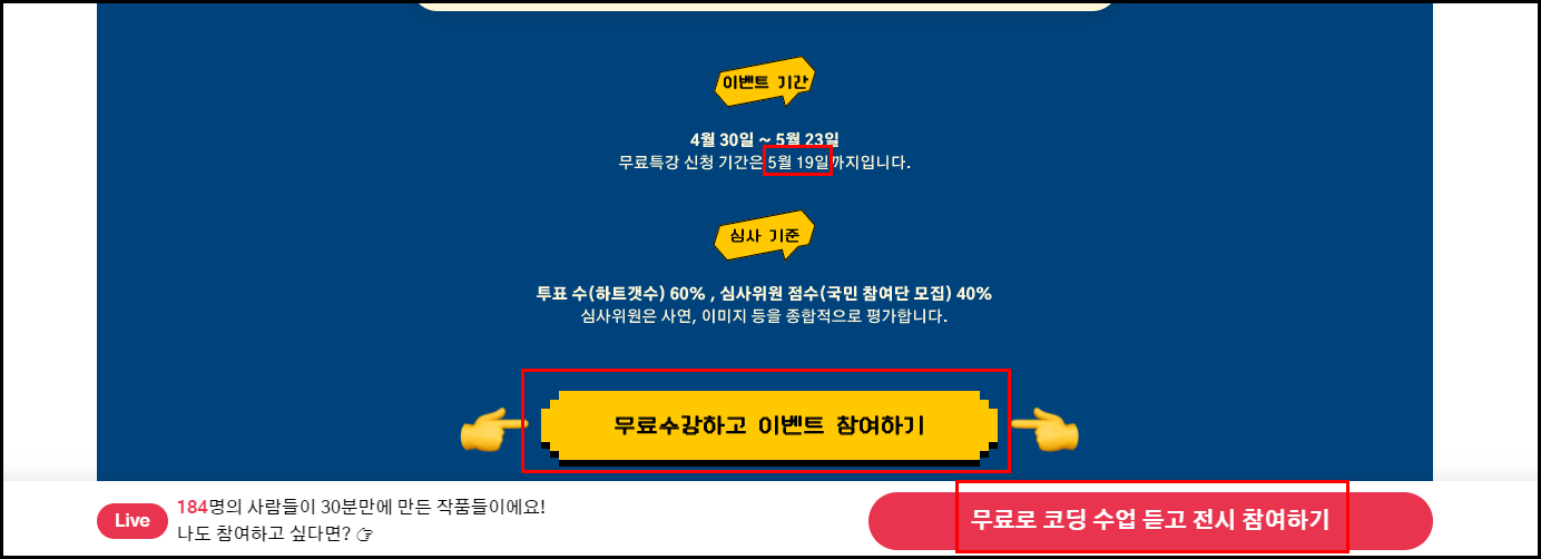 - 맨 아래에서 계속 따라오고 있는 '무료로 코딩 수업 듣고 전시 참여하기' 버튼을 눌러주세요.