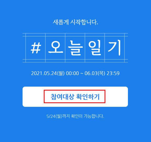 새롭게 시작합니다. #오늘일기 2021.05.24(월) 00:00 ~ 06.03(목) 23:59 참여대상 확인하기 5/24(월)까지 확인이 가능합니다.