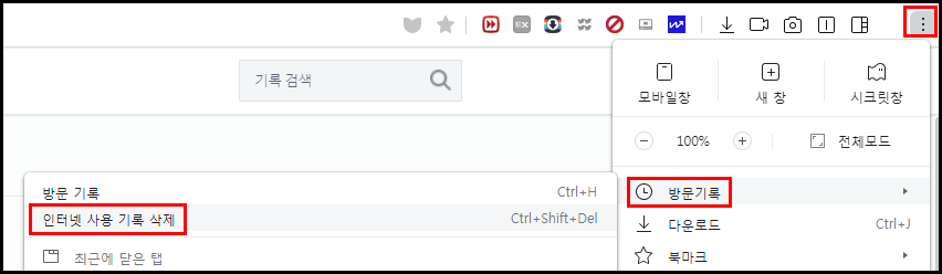 - 방문 기록 > 인터넷 사용 기록 삭제를 클릭합니다.