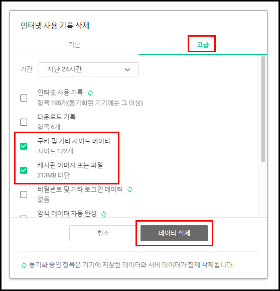 - 인터넷 사용 기록 삭제 창이 뜨면 고급 탭에 들어가 주세요.