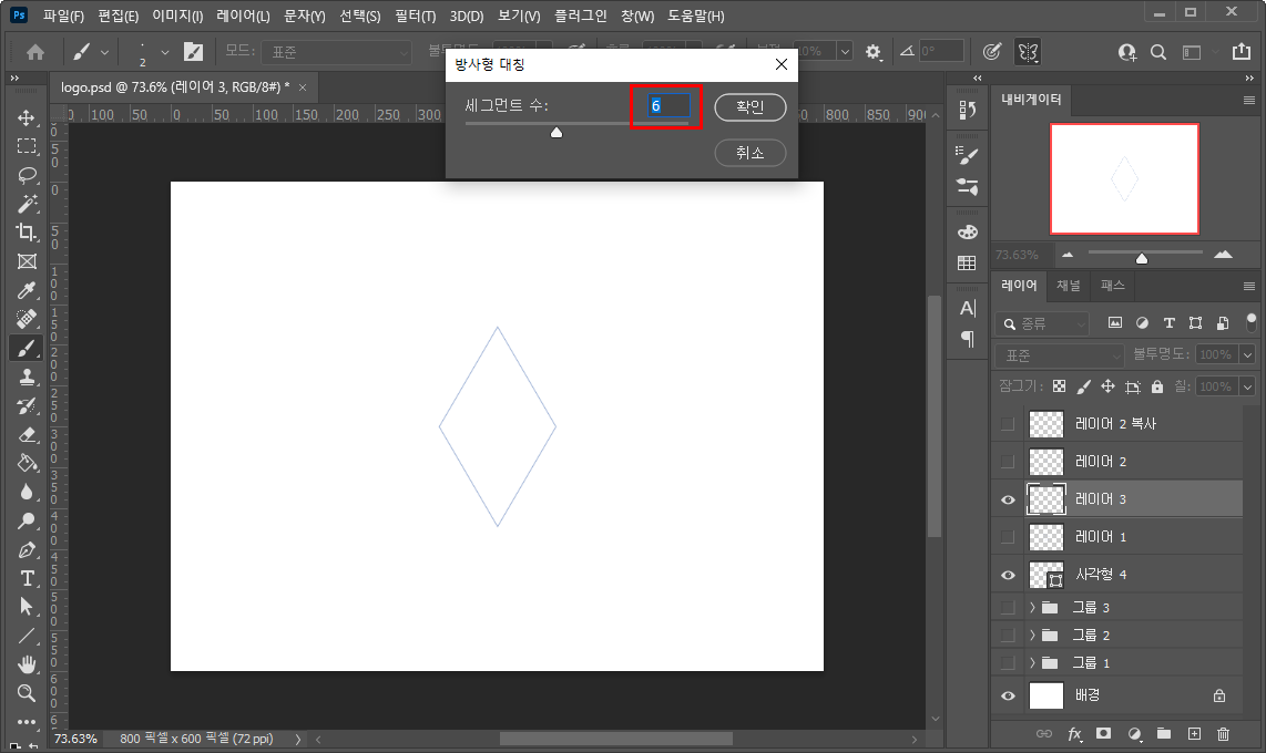- 방사형 대칭을 누르면 어떤 수를 설정하라고 나오는데요 몇 칸에 나눠서 대칭을 만들지 결정해주는 것입니다.