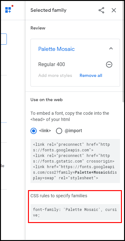 - 오른쪽에서 화면이 슬라이드 되어 열리면 웹폰트를 넣을 수 있는 코드가 나옵니다.