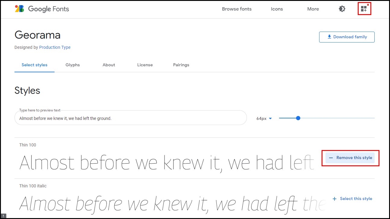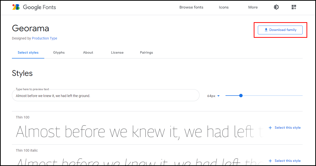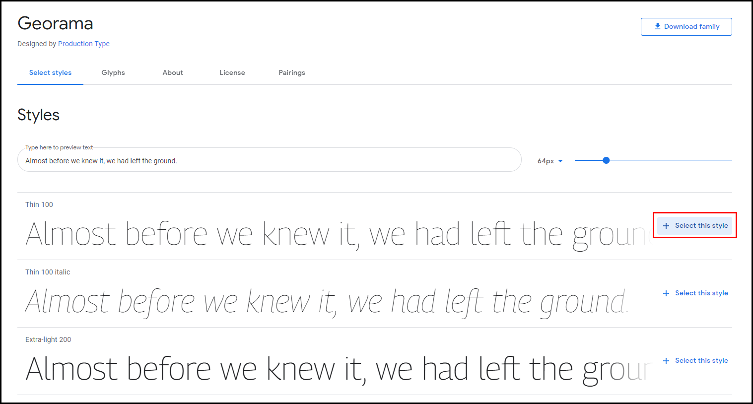- 서체를 다운받았던 페이지에서 조금 아래로 내려보면 select this style 이라고 적혀있고 +(플러스)가 쓰인 버튼이 보이실 거예요.