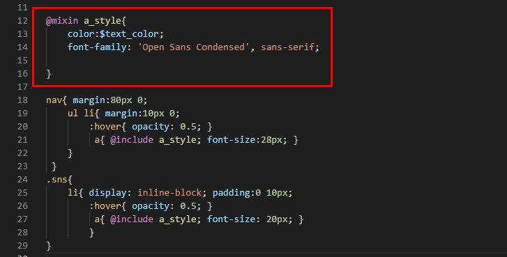 - 위에서 본 형식대로 @mixin 이름{ } 을 적어주세요. 이름은 언제나 그렇듯 직관적인 이름으로 지어주세요.