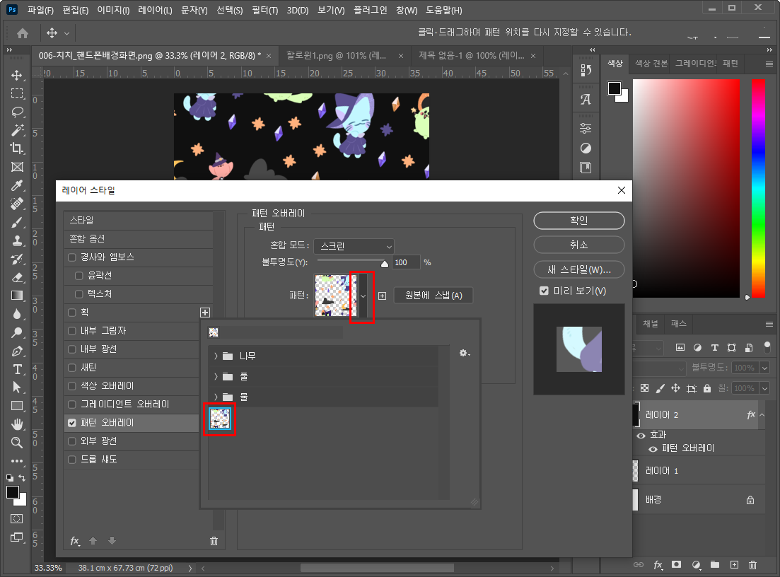 - 레이어 창 아래에서 [레이어 스타일 > 패턴 오버레이]를 선택해주세요.