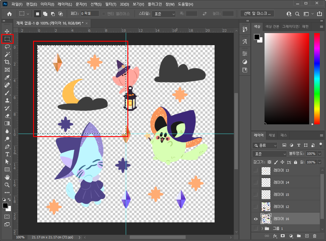 - 사각 선택 툴을 이용해 왼쪽 위 칸을 영역 잡아주세요.