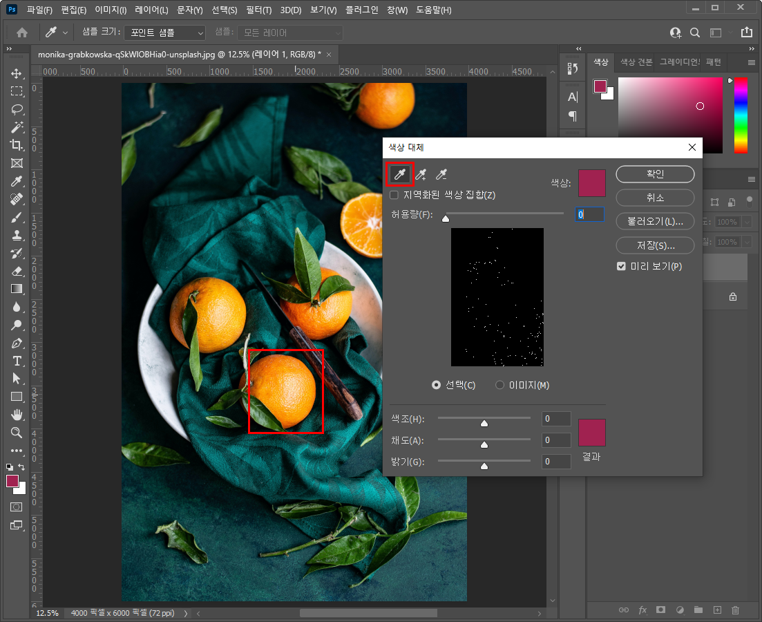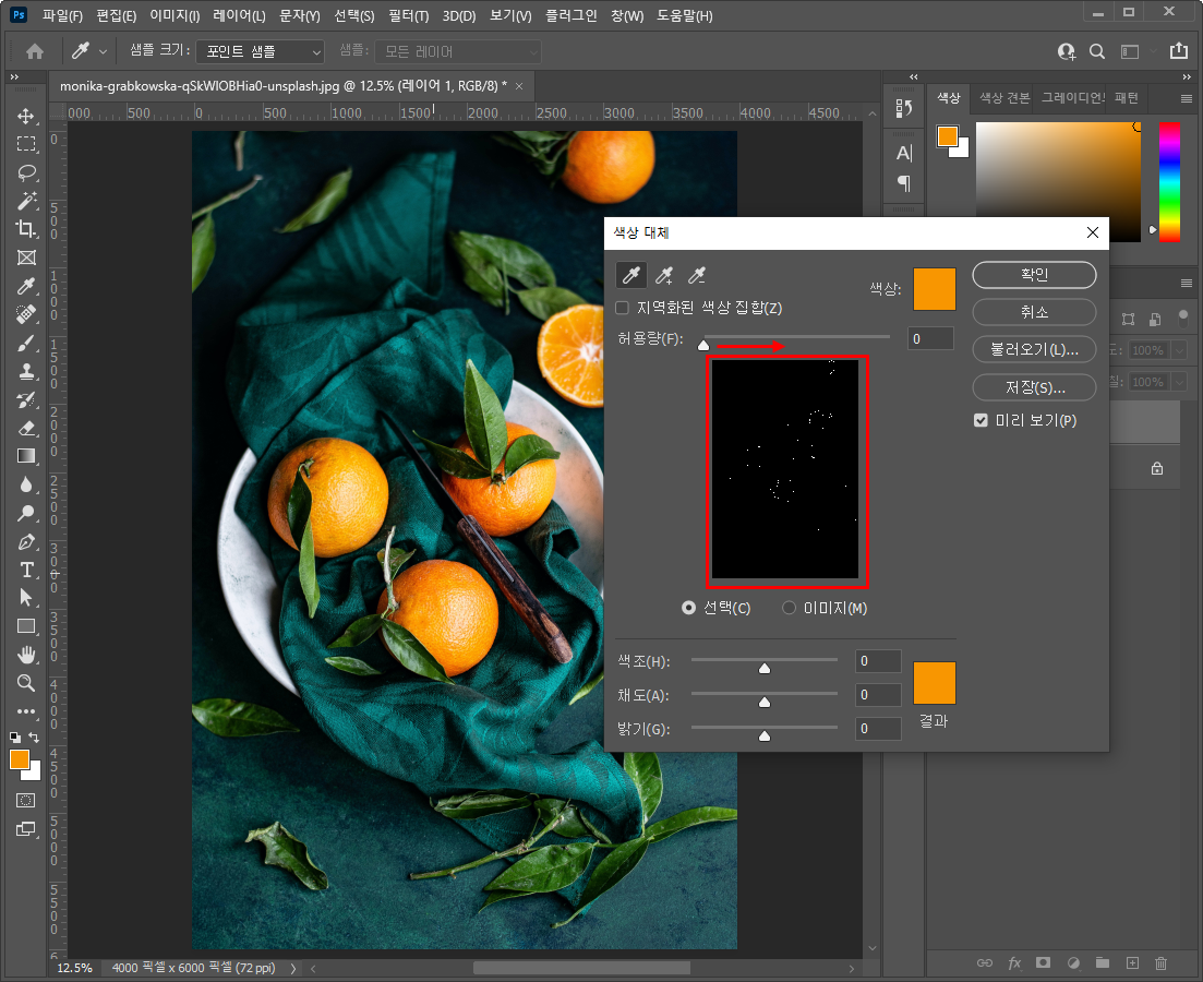- 색상 대체 창이 뜨면 맨 위에 스포이드가 선택된 상태로 오렌지를 클릭해주세요.