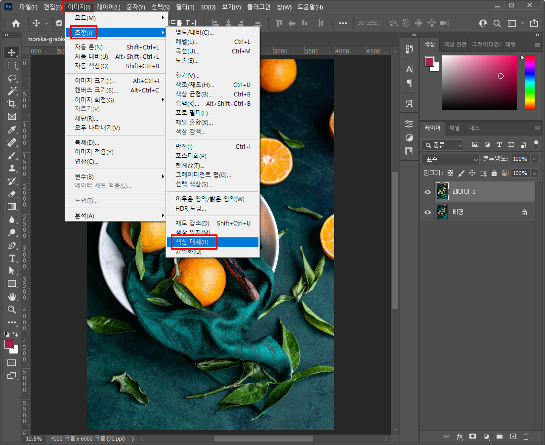 - 상단 메뉴에서 [이미지 > 조정 > 색상 대체] 메뉴를 선택해주세요.