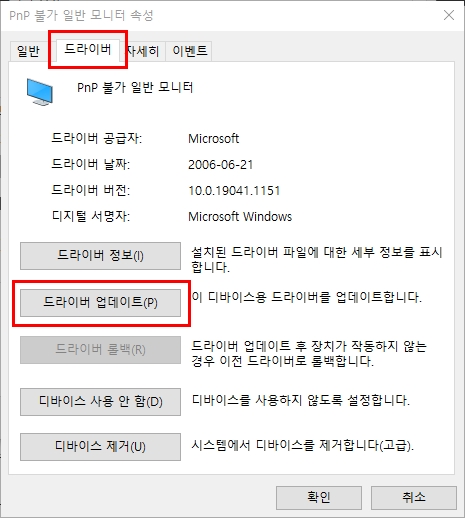 - 그리고 아래에서 [드라이버 업데이트] 버튼을 클릭합니다.