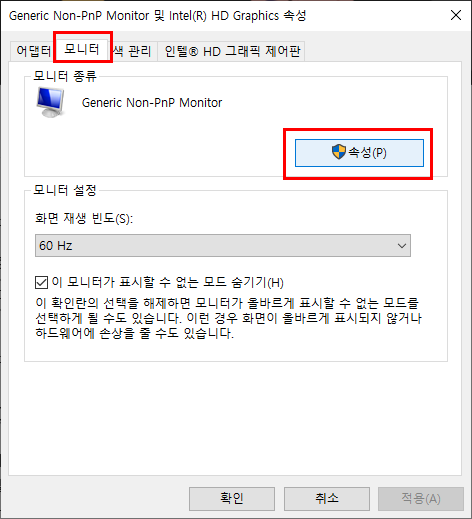 - 속성 창에 들어오시면 탭이 여러 개 뜨는데 두 번째에 있는 [모니터]탭에 들어가 주세요.