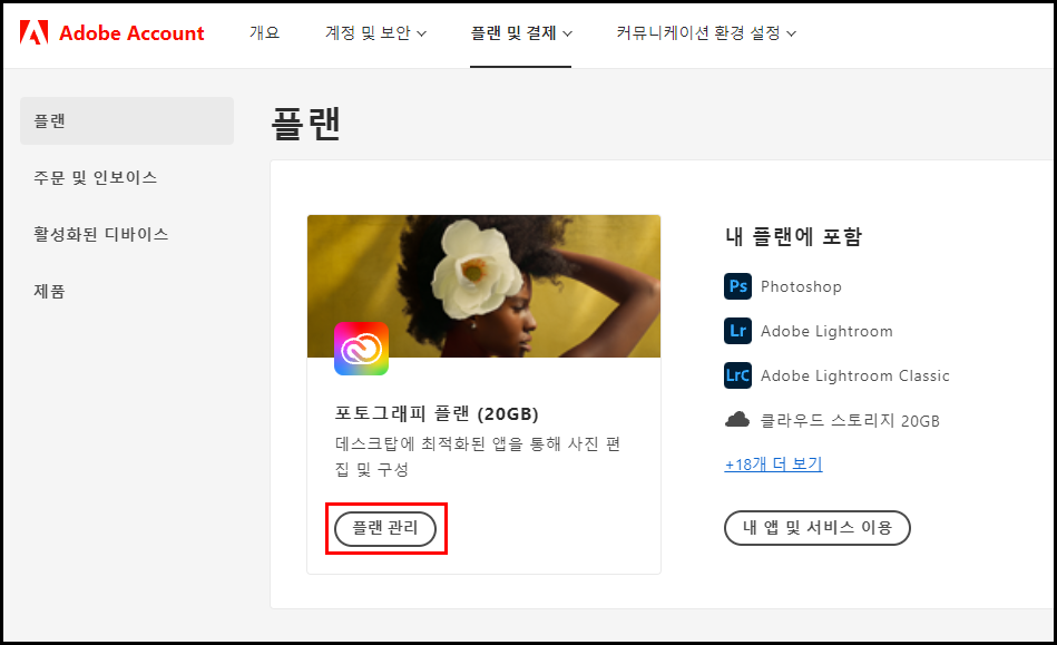 - 내가 선택한 플랜이 보이는데 여기서 [플랜 관리] 버튼을 클릭해주세요.