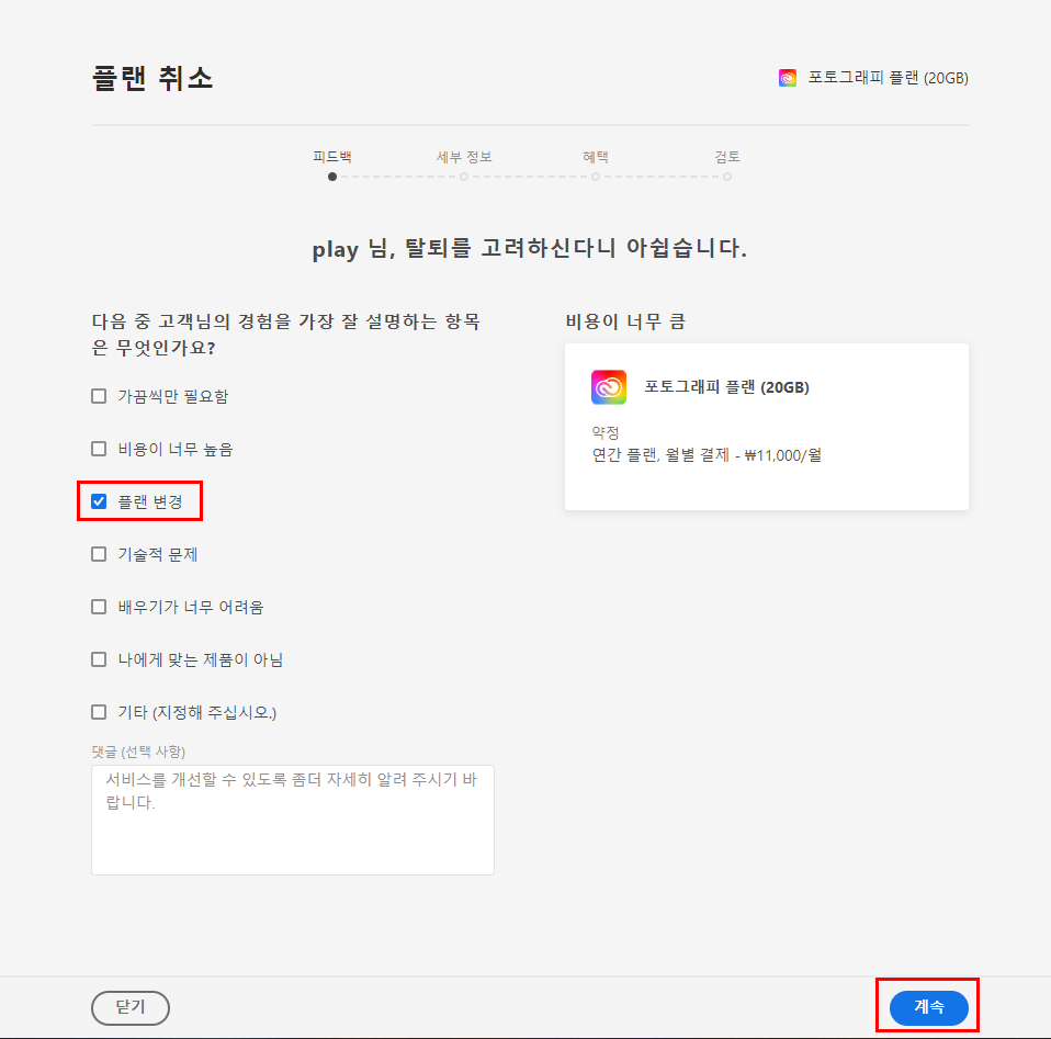 - 플랜을 취소하면 이유에 대해 설문조사를 합니다.