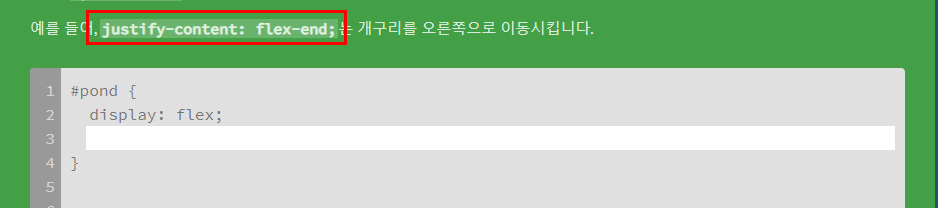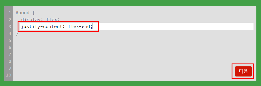 첫 문제인만큼 아예 정답도 알려줍니다. justify-content은 아이템의 배치에 대해서 설정할 수 있는 속성이에요. flext-end는 끝에서 정렬 가로로 되어있으니 오른쪽 정렬이 되겠죠? 그런 속성 값입니다.