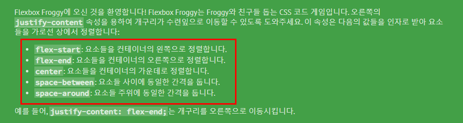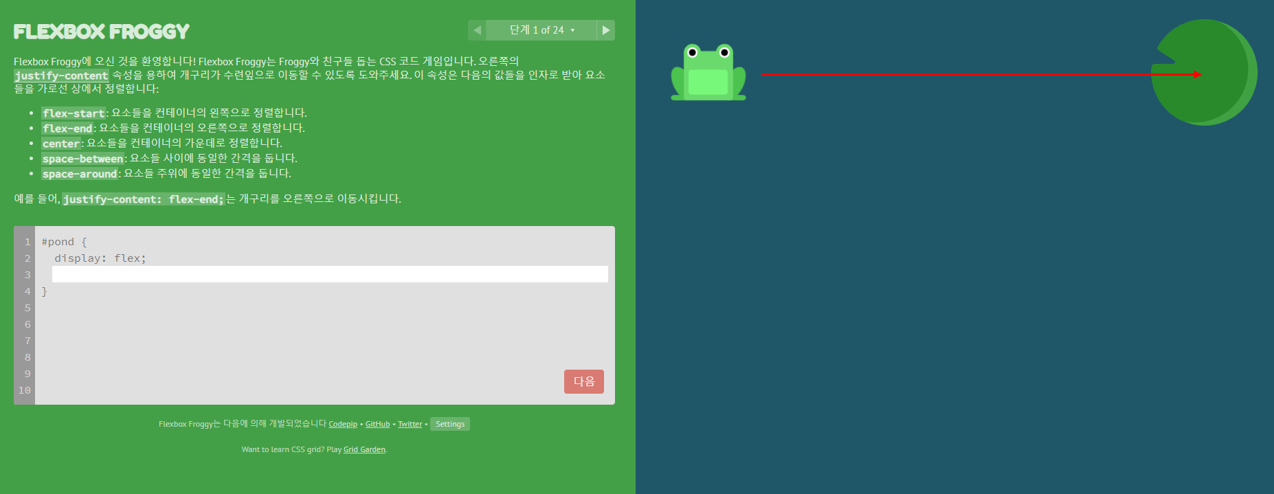 짠! 개구리가 연잎 위에 무사히 안착했죠? 여러분의 개구리도 연잎 위로 잘 올라갔나요? 총 24 문제가 있으니까 연습해보면서 flexbox에 대한 감을 익혀봅시다!