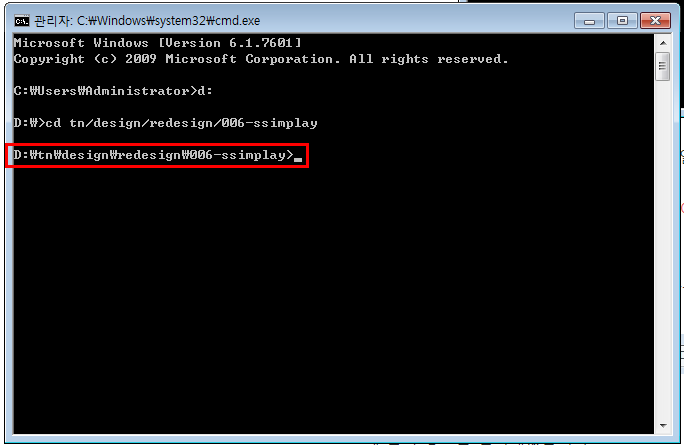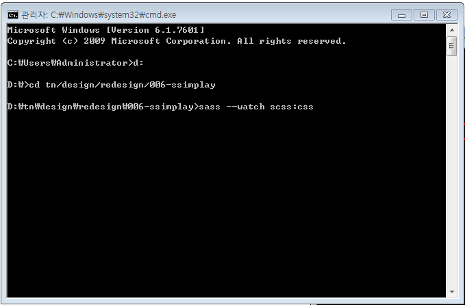 다음은 cd명령어를 이용해 scss를 실행할 파일로 경로를 이동합니다.