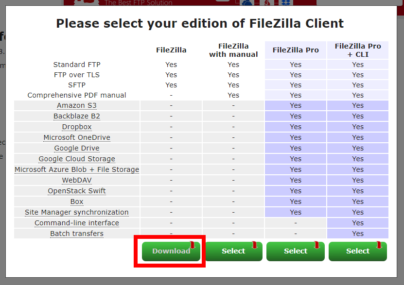 큰 초록색 버튼인 Download FileZilla Client 버튼을 클릭합니다.