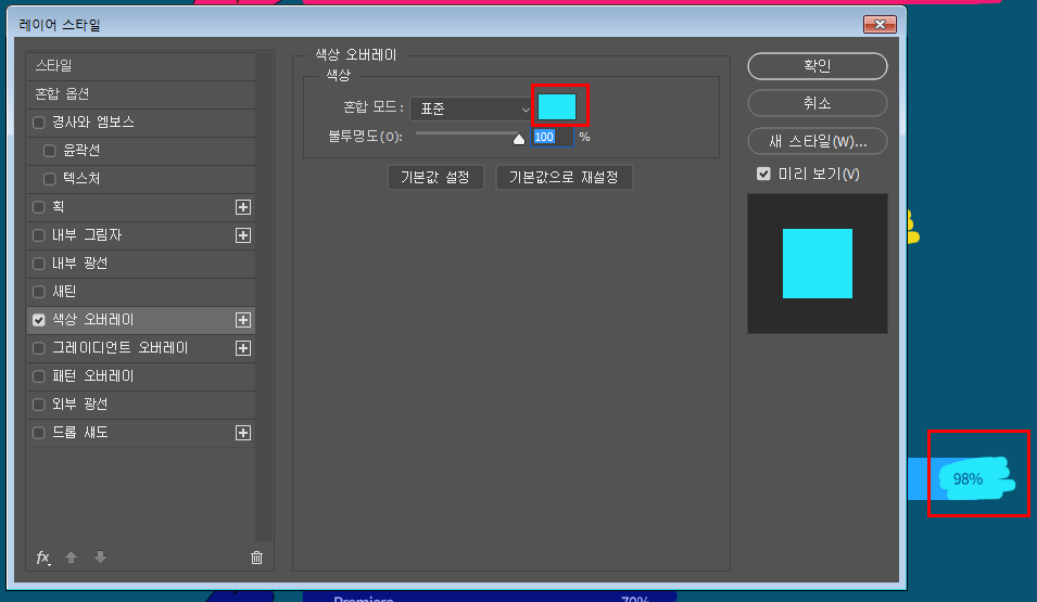 여러 스타일이 있는데 그중 색상 오버레이를 선택합니다.
