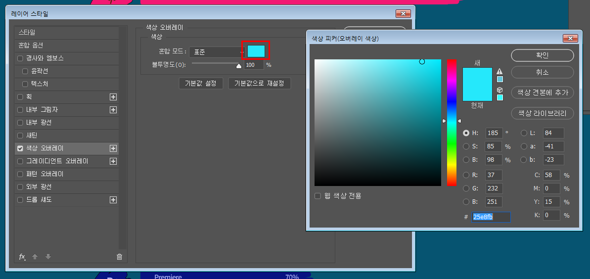 그리고 색상 파커 창에서 확인, 레이어 스타일 창에서 확인.