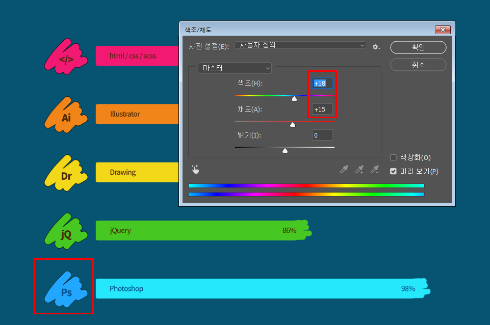 경우에 따라 채도와 밝기도 같이 조정해줍니다.