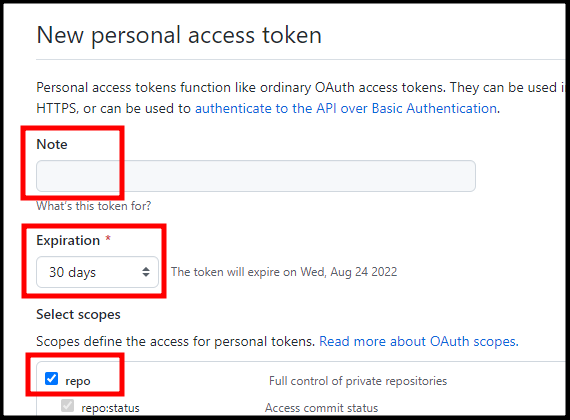 이름, 유효 날짜, 레파지토리(repo) 기능 등을 설정하시고