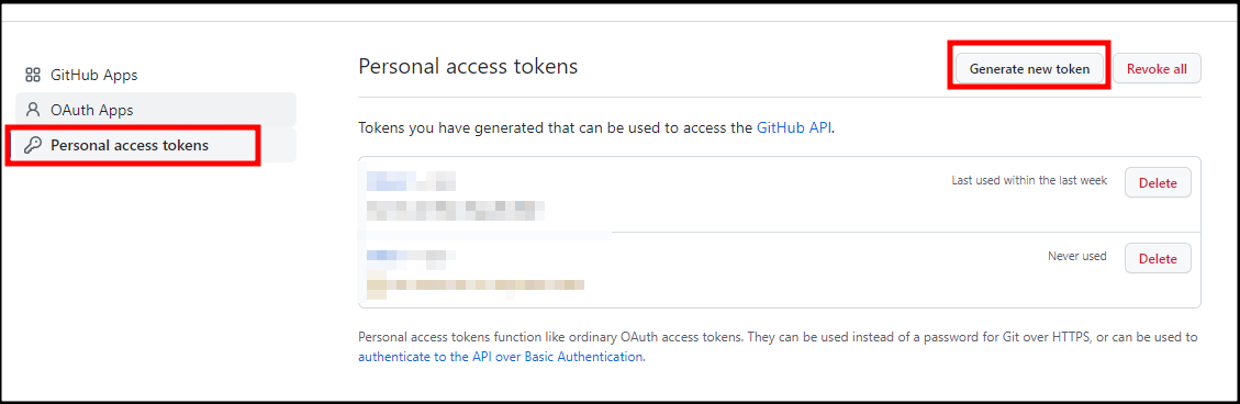 그리고 오른쪽 상단 Generate new token 버튼을 클릭해 토큰을 생성해주세요.