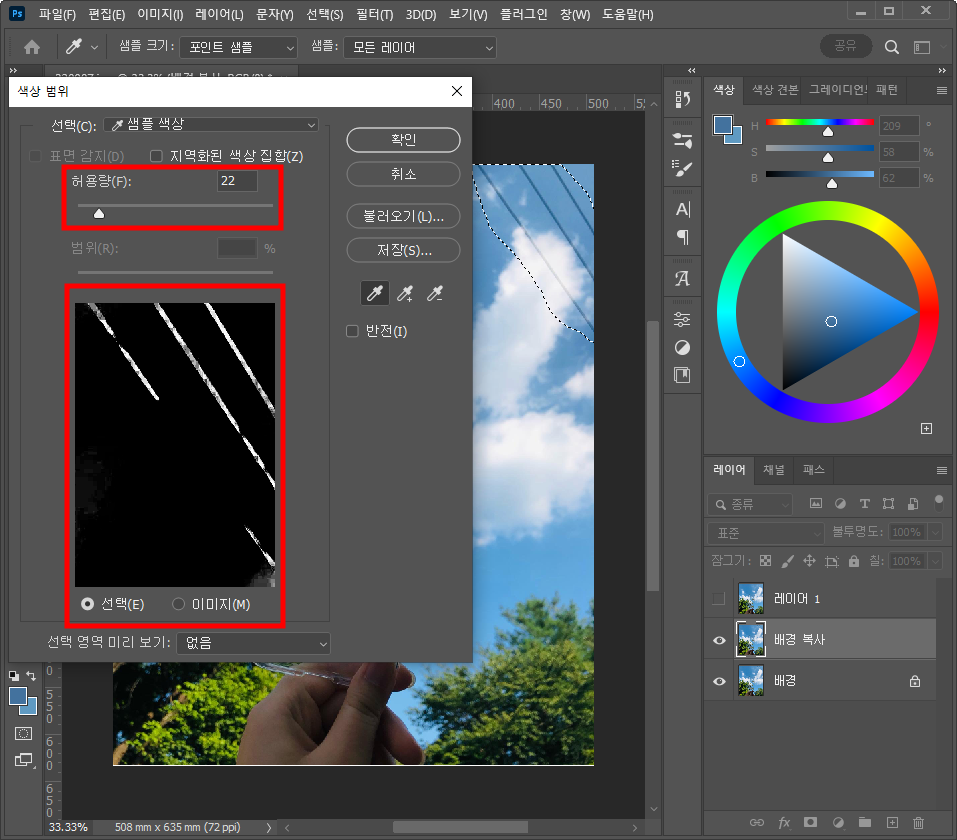 색상 범위 창이 열리면