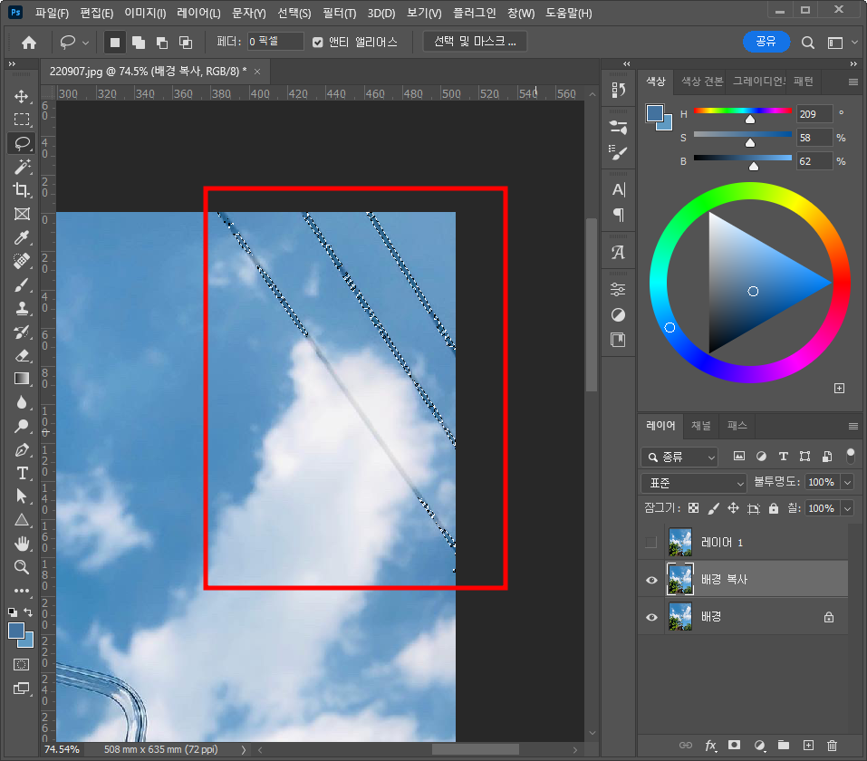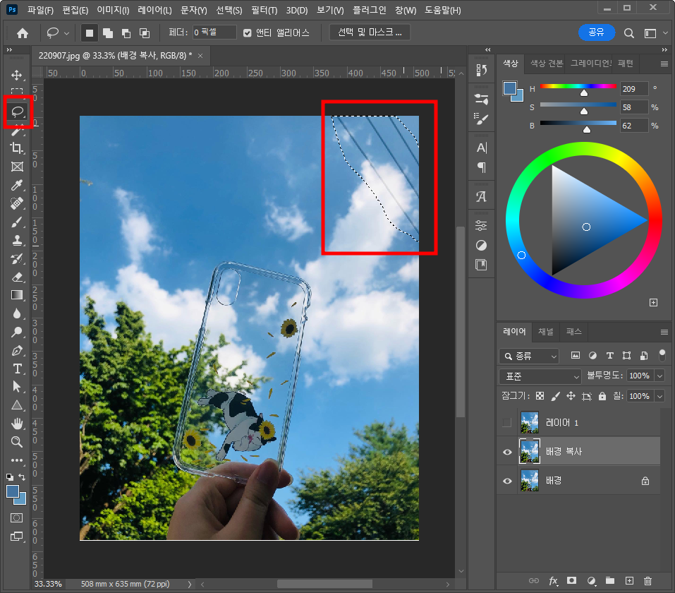 전깃줄부분을 대충 선택 영역으로 만들어줍니다.