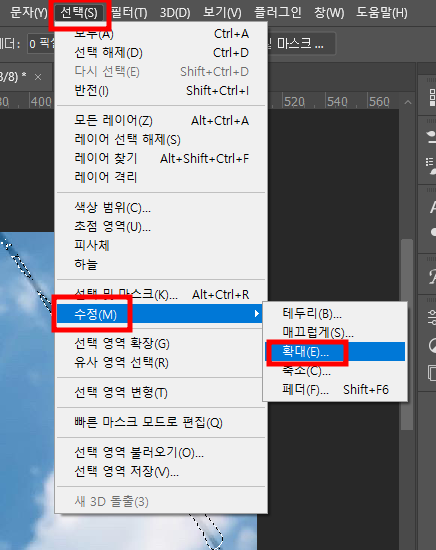 [선택 > 수정 > 확대] 메뉴를 클릭합니다.