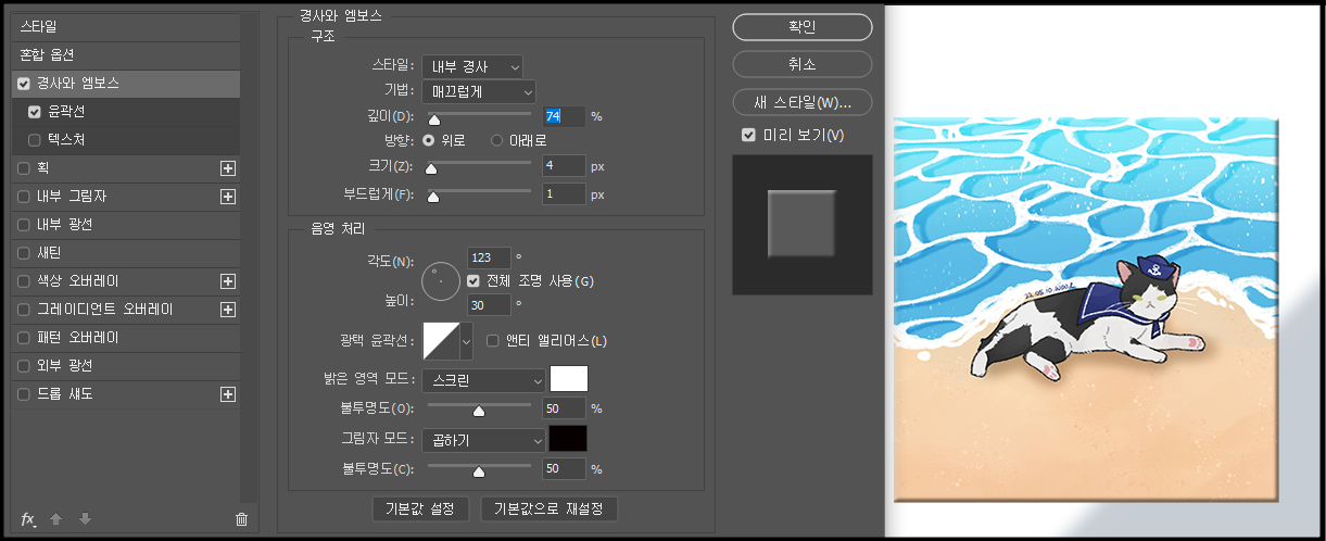 아래쪽 옵션은 윤곽선만 체크되어있었는데요.