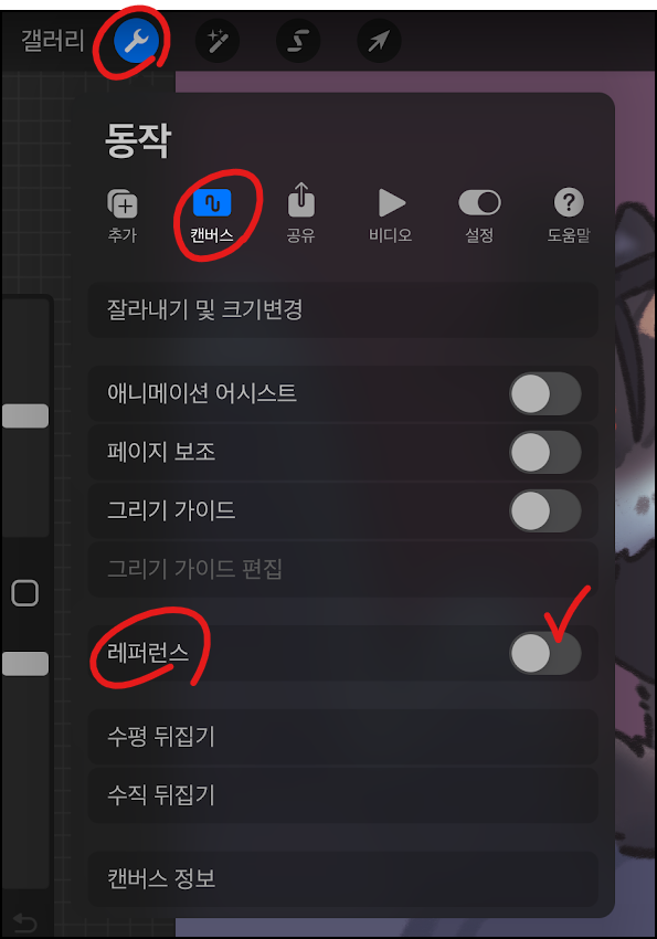 [캔버스 > 레퍼런스] 기능을 켜줍니다.