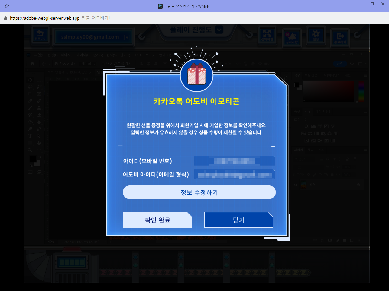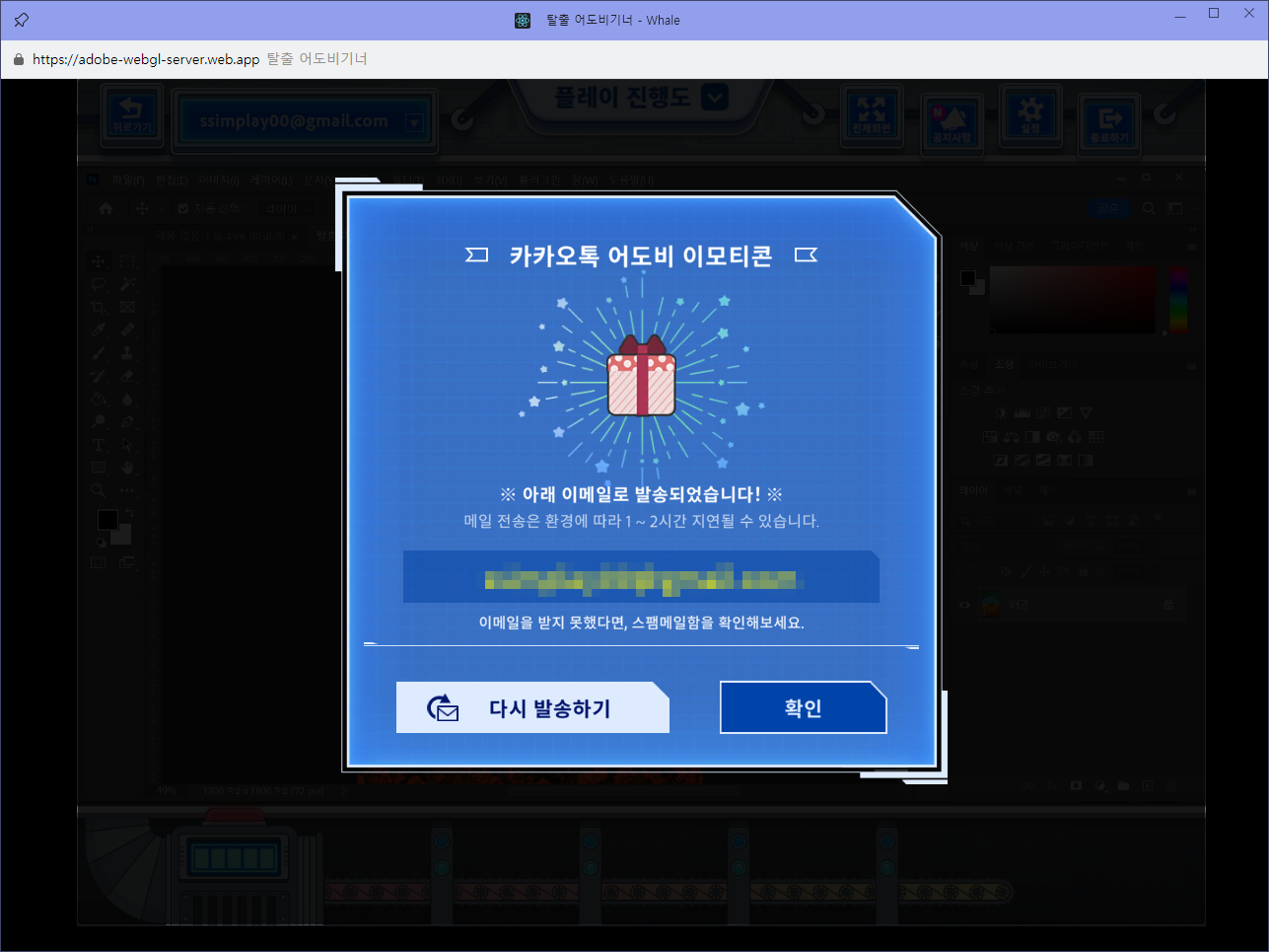 확인을 누르면 이메일로 이모티콘을 발송했다는 메시지가 나옵니다.
