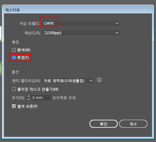 만약 CMYK가 아니라면 일러스트 파일 자체 색상이 RGB 모드일 것입니다.