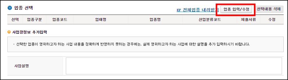 [업종 입력/수정] 버튼이 있는데