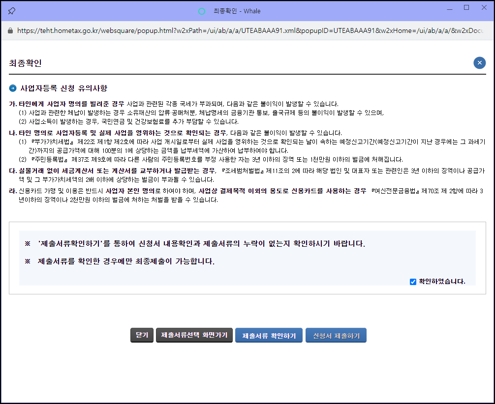 주의사항을 잘 읽어보시고 [확인하였습니다.] 체크