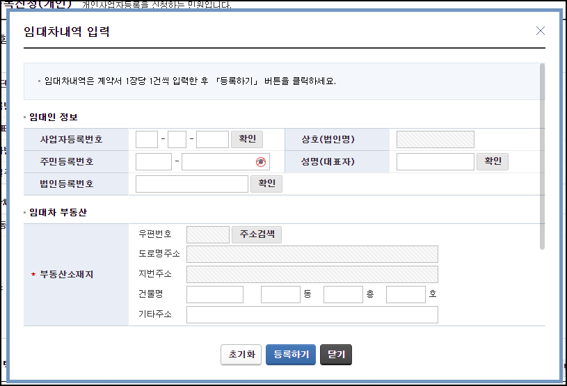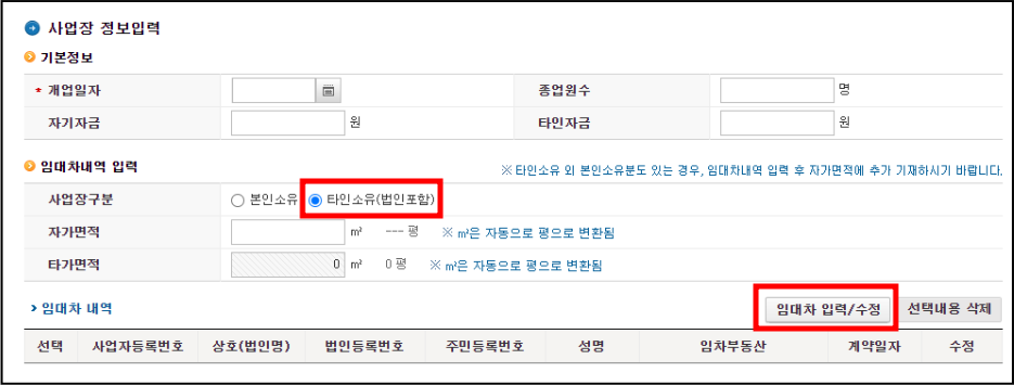업종을 선택할 때와 마찬가지로 [임대차 입력/수정] 버튼을 클릭해 입력합니다.