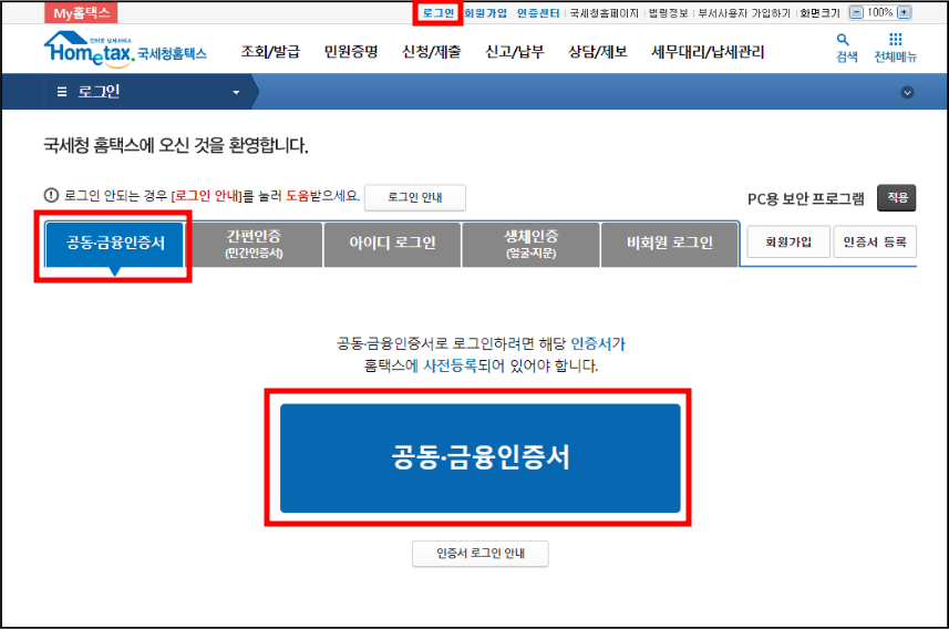 [로그인 > 공동·금융 인증서 > 공동·금융 인증서]를 선택