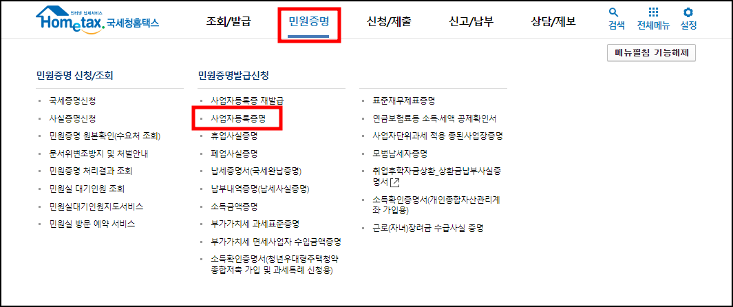 [민원증명 > 사업자등록증명] 메뉴로 접속해