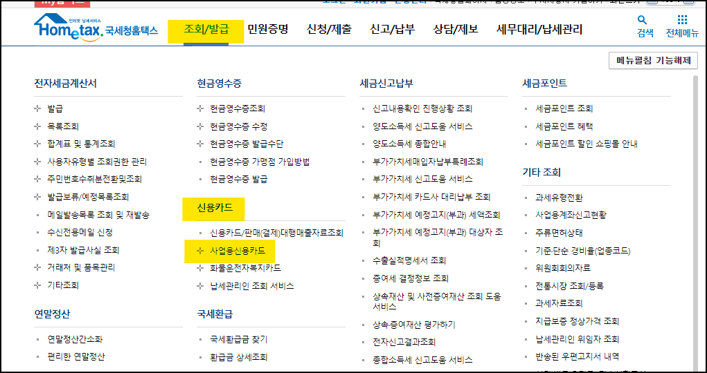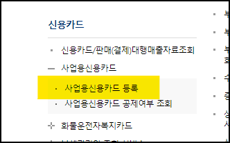 홈텍스에서 [조회/발급 > 신용카드 > 사업용신용카드] 메뉴를 클릭합니다.