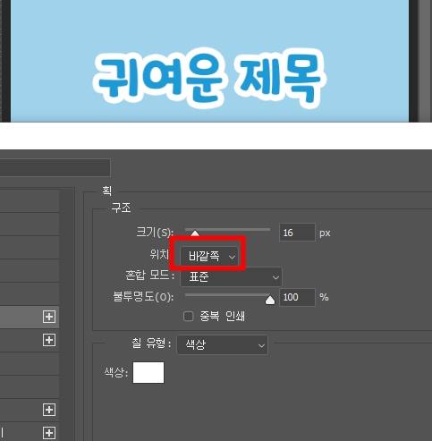 획은 주로 흰색으로 설정하는데색상은 상황에 따라서 바꿔주세요. 위치를 [바깥쪽]으로 해주시면 동글동글하고 귀엽게 나옵니다.