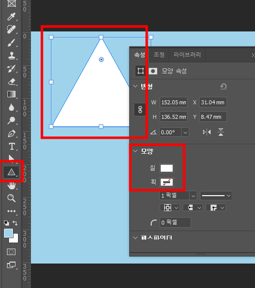 도형툴을 이용해 흰색 삼각형을 만들어줍니다.