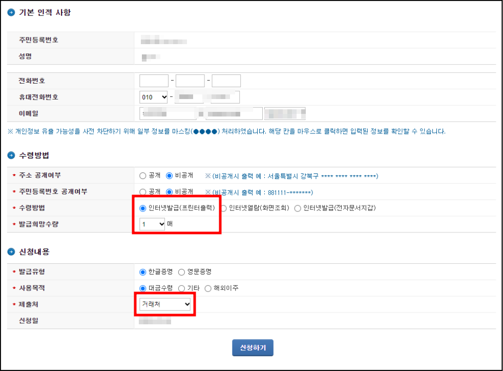 그리고 제출처를 확인해 주시고 신청하기 버튼을 클릭합니다.