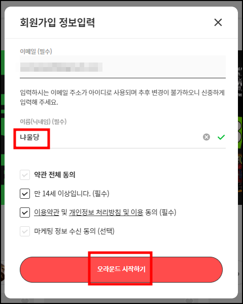닉네임으로 여기도 냐울당이라고 입력해 주었어요.