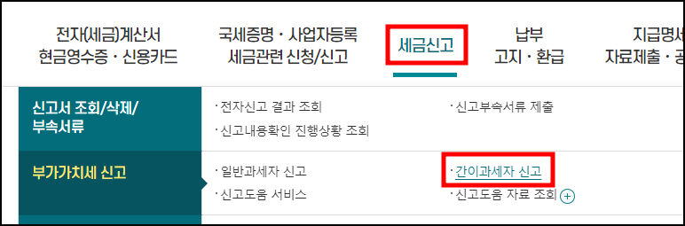 상단 메뉴에서 [세금신고 > 부가가치세 신고 > 간이과세자 신고]