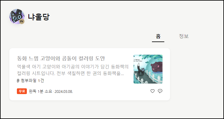 안냥하세요. 먹물색 아기고양이 멍무리와 소소한 재미를 그리는 일러스트레이터 냐울입니다. 소소한 즐거움을 직접 느껴보실 수 있게 컬러링 시트를 판매하고 있습니다. 일상에 힐링과 즐거움