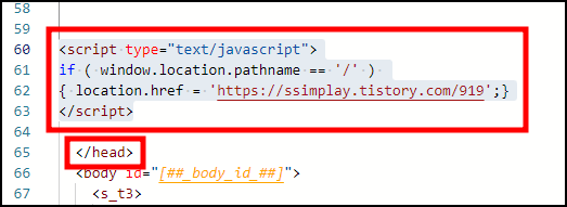 { location.href = '메인에 올리고 싶은 포스팅 URL';}